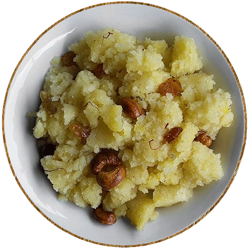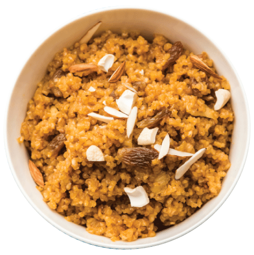 Delight in the heavenly taste of gently roasted and simmered with ghee, sugar, and aromatic cardamom, garnished with crunchy nuts.